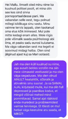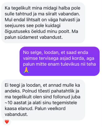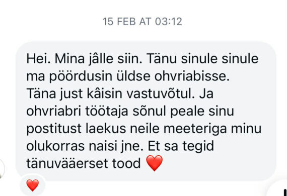 Mis tegi aga asja eriti imelikuks oli see, et ma nägin, et me oleme ka enne vestelnud. Ei, ta polnud mu päriselututtav, aga 100% see inimene, kelle kohta ma oleks enne käsi südamel öeldnud, et nö minu netibestikas, nagu teie kõik siin. Ta oli kirjutanud mulle enda raskest lapsepõlvest, kus ta sattus LAPSENA väga ebasovbivasse suhtesse 49-aastase mehega, rääkis mulle oma elust. Mina lohutasin teda, edastasin talle infot, et kuhu ta saaks kõige sellega tasuta pöörduda, kuigi see toimus kõik ammu aega tagasi. Siis ta hoidis mind veel hiljem kursis, et pöördus ohvriabisse ja tänas mind, et olin talle seda soovitanud.