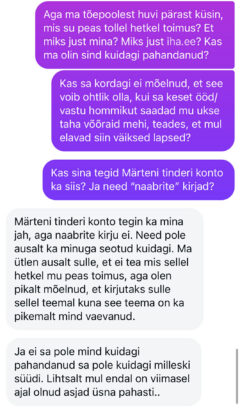 Aga ikka peab endast kah gossi jagama. Või noh, see pole otseslet minust aga… minu suunas küll. Nimelt olete te kõik jupp aega minu käest küsinud, et kes oli see inimene, kes mulle iha.ee’sse konto tegi ja mina kehitasin alati õlgu. Politsei pakkus mulle juba esimesel ülekuulamisel ühte nime, aga kuna ma sellenimelist ei tundnud, jäi asi sinnapaika. Suur oli minu imestus, kui täna sain instasse kirja, kus üks naisterahvas vabandab selle eest, et ta mulle ihasse ja Märtenile Tinderisse konto tegi.